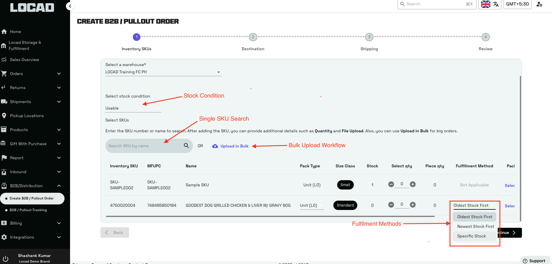 The Locad Control Tower allows you to create B2B (Business-to-Business) and Pullout Orders directly, without needing to contact our support team. This feature is designed for fulfilling large orders to retail partners, distributors, or other offline channels.
