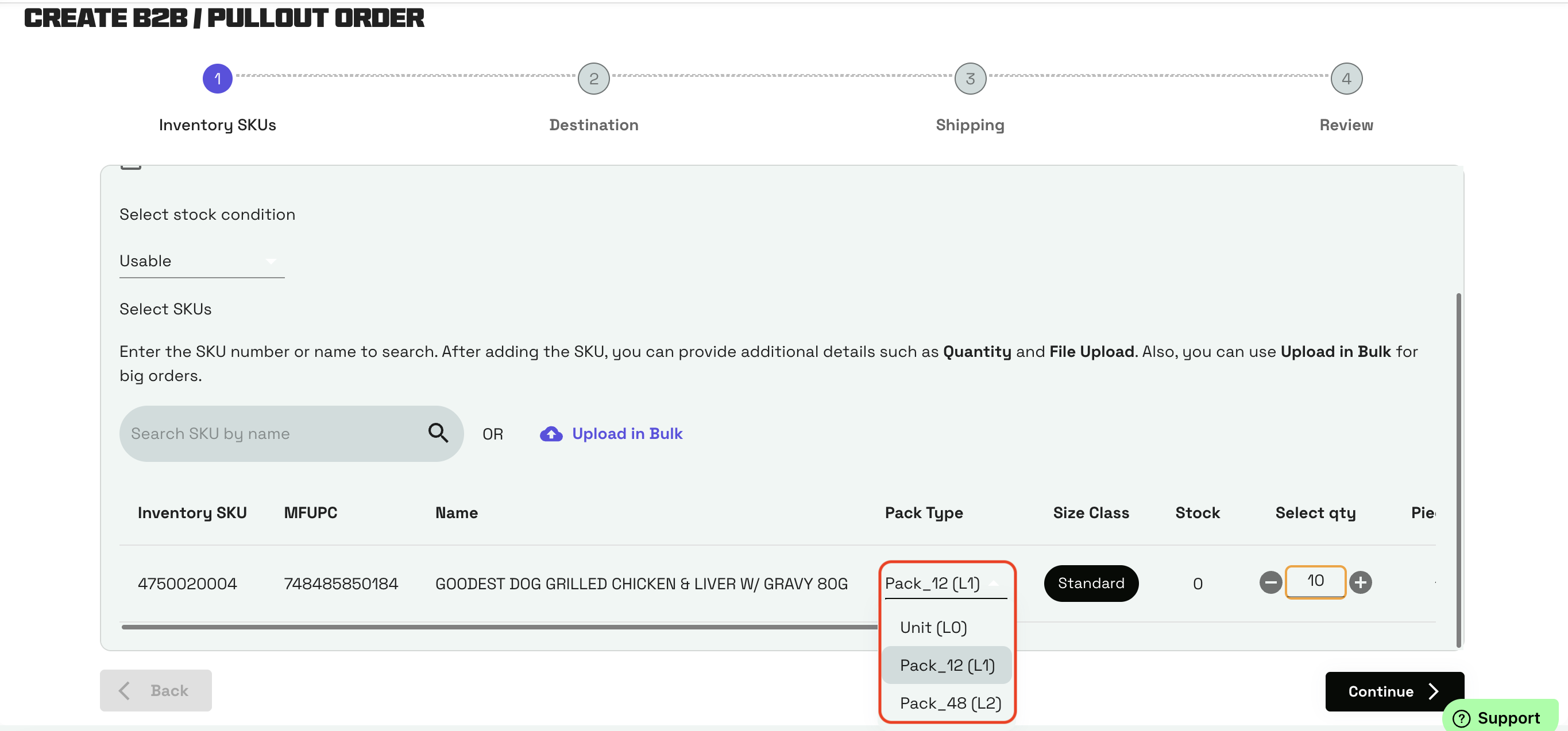 Pack_12 (L1)as the Pack Type, and set the quantity to10.Line 2: Add the same SKU again, select