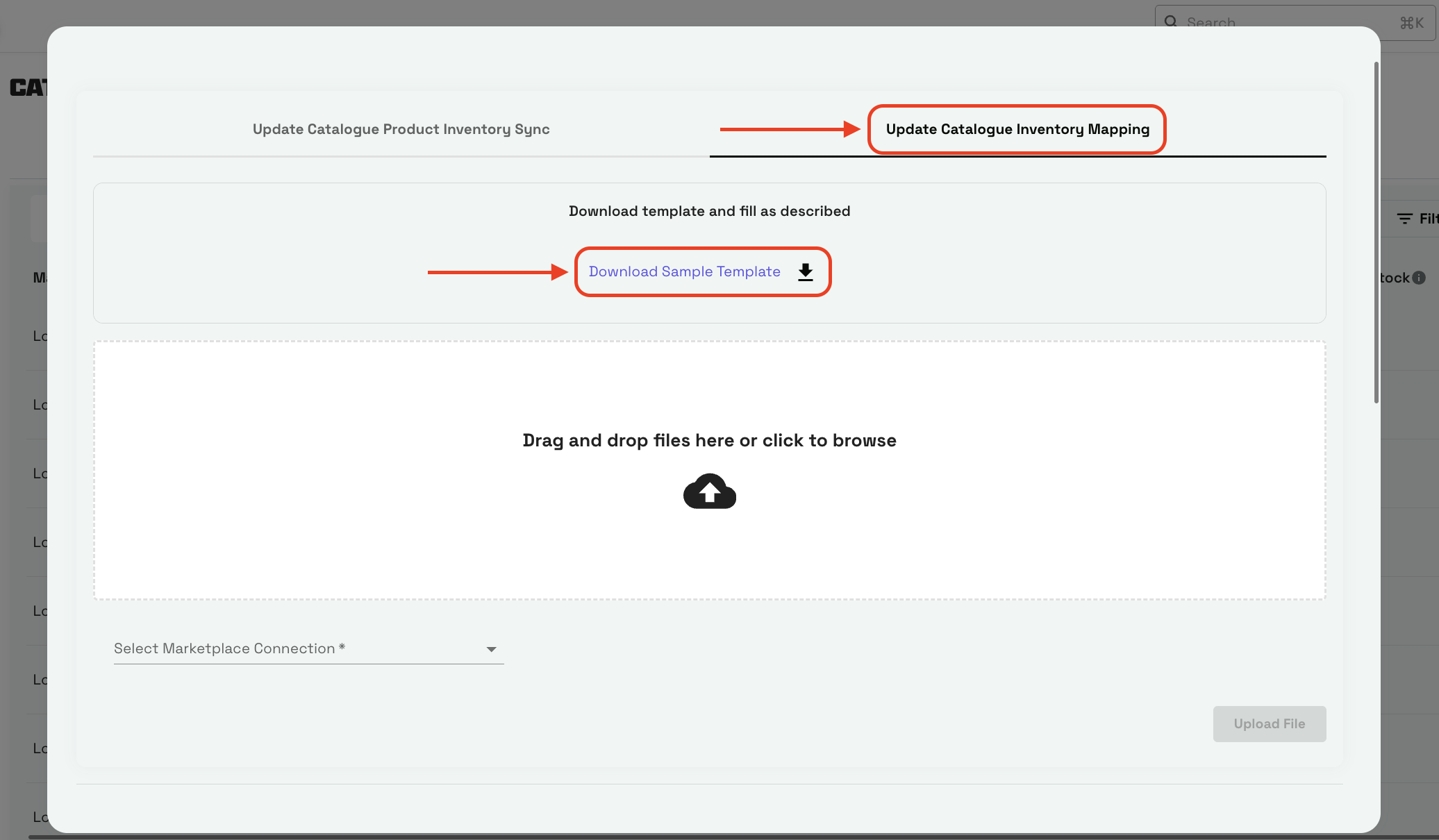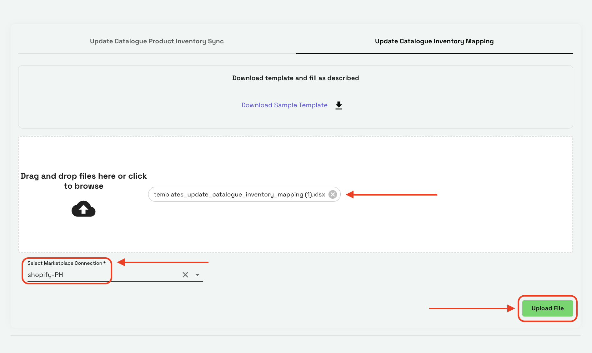 Ans: Yes. You simply add a new row in the Excel file for every inventory item you wish to link. Keep theCATALOGUE_PRODUCT_SKUthe same for those rows, but change theINVENTORY_PRODUCT_SKUandUNITSaccordingly. - Why do I need to select a "Marketplace Connection" before uploading?