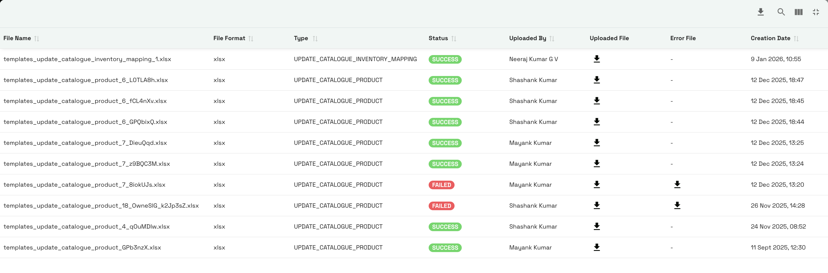 If the status column shows Failed, you must download the error file to identify the issue.