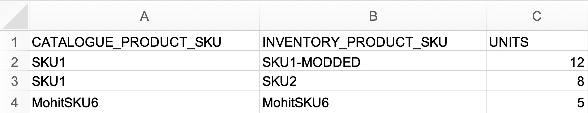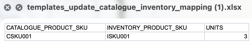 CATALOGUE_PRODUCT_SKU: The Catalogue SKU as it appears on your Catalogue Product Detail Page.INVENTORY_PRODUCT_SKU: The corresponding Inventory SKU as it appears on your Inventory Product Detail Page.UNITS: The quantity of the inventory item included in this mapping.
