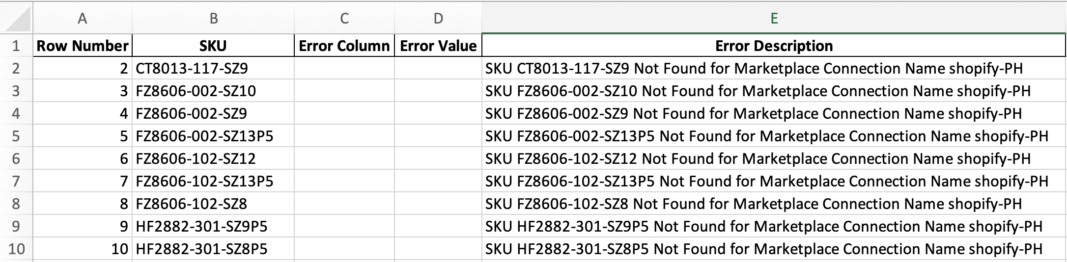 Verify that you selected the correct Marketplace Connection (shop name) in Step 4. If the SKU belongs to a different shop, re-upload the file selecting the correct shop name.