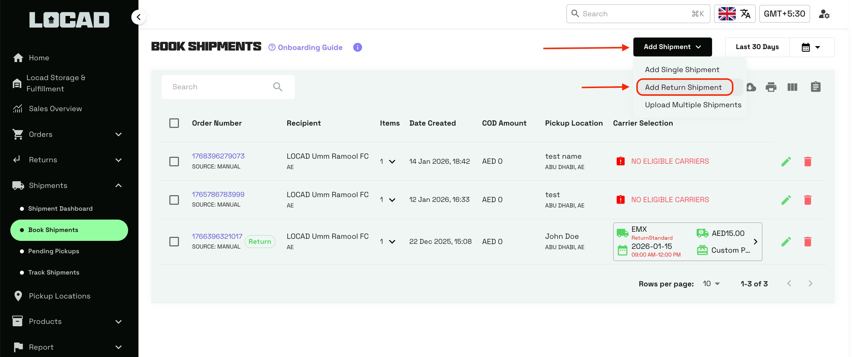 Navigate to Book Shipments: Log in to the Locad OMS and click on Book Shipments in the left-hand sidebar.