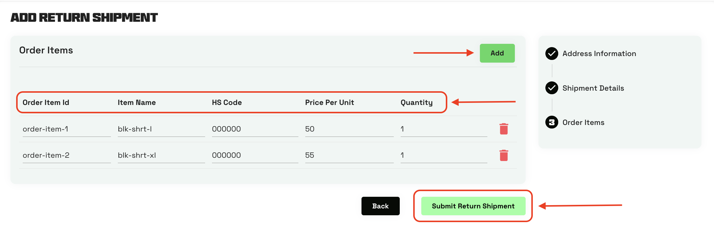 Initiate Return: Click the Add Shipment dropdown button in the top right corner and select Add Return Shipment.