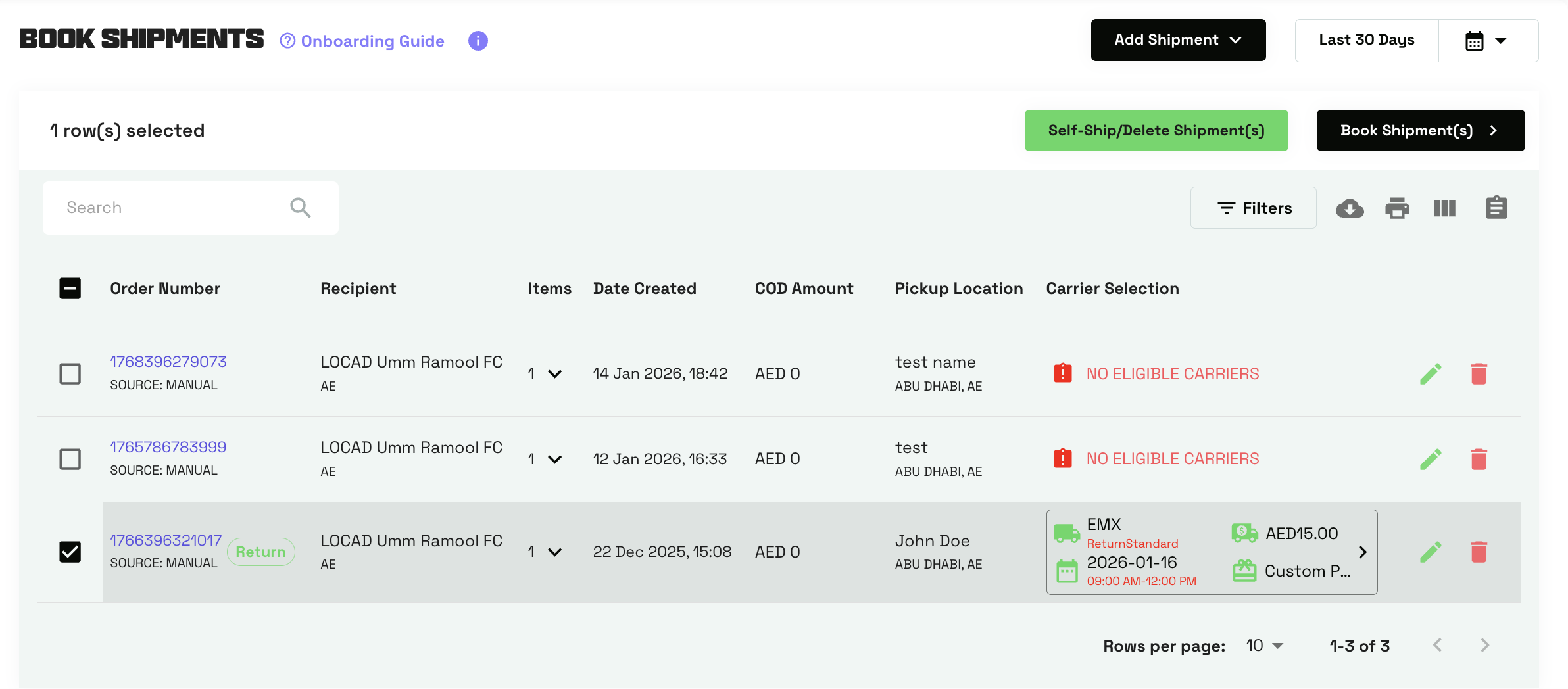 Success! The return order is now created and will appear in the main Book Shipments list.