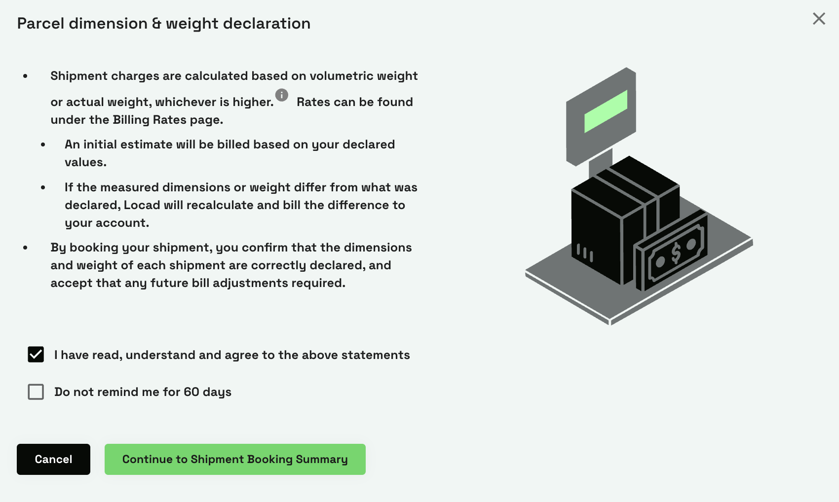 Declaration: A "Parcel dimension & weight declaration" popup will appear. Read the terms, check the acknowledgement box, and click Continue to Shipment Booking Summary.