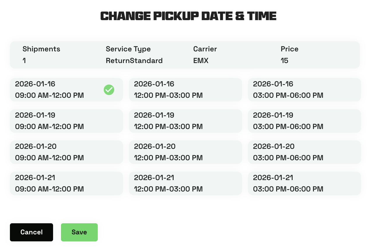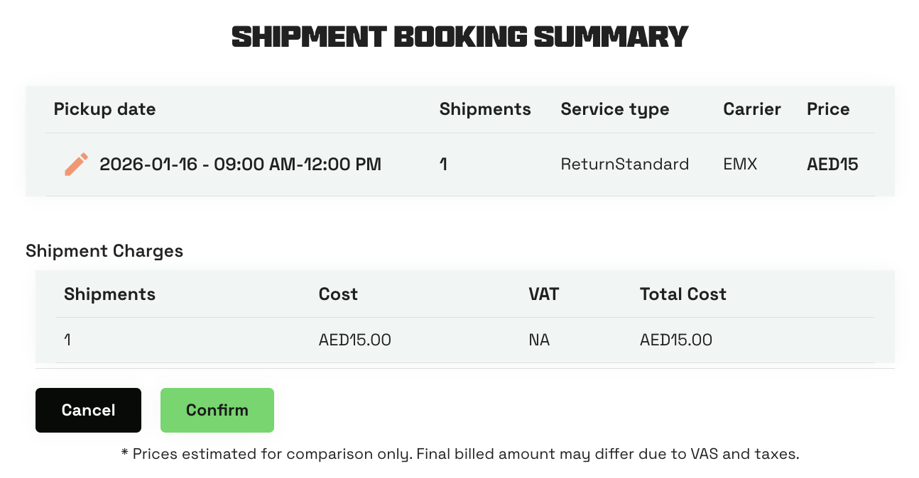 Confirm Booking: Review the details in the summary (ensure the Carrier is EMX and Service Type is ReturnStandard). Click Confirm.