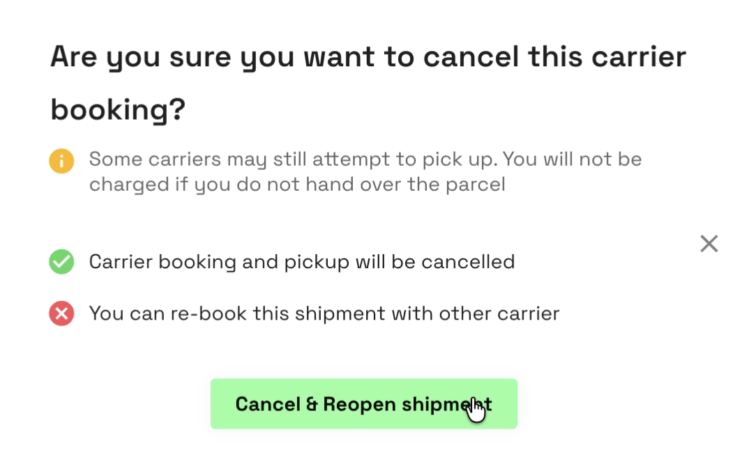 Confirm Cancellation: A popup will ask for confirmation. Click Cancel & Reopen shipment.