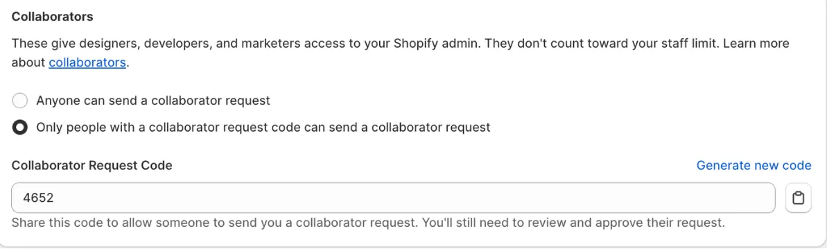 Only people with a collaborator request code can send a collaborator request: This is a more secure option. If you select this, you must copy the 4-digit code and send it to the partner who needs to request access.