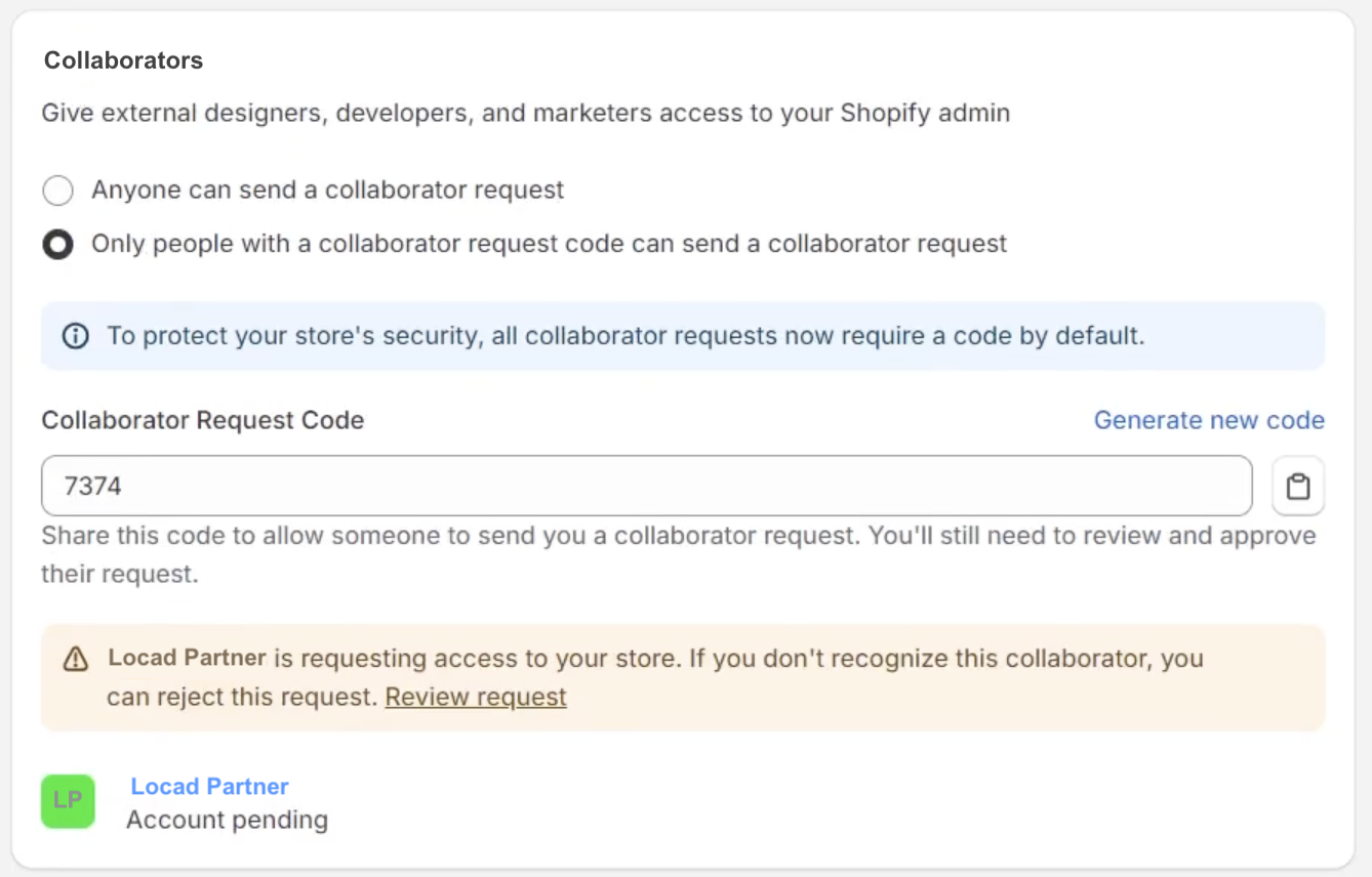 The Shopify collaborator access feature allows store owners to securely grant external partners - such as Locad - access to their Shopify admin. Instead of creating a staff account, partners can request access directly through their own Shopify Partner Dashboard. As the store owner, you maintain full control and can approve, reject, or customize the permissions granted to each collaborator. They’re one of the most flexible accounts available from Shopify, giving store owners complete control over the sections of a store the collaborator can access.