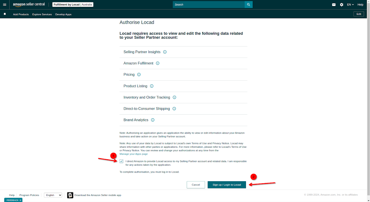 Check the box next to: "I direct Amazon to provide Locad access to my Selling Partner account..."