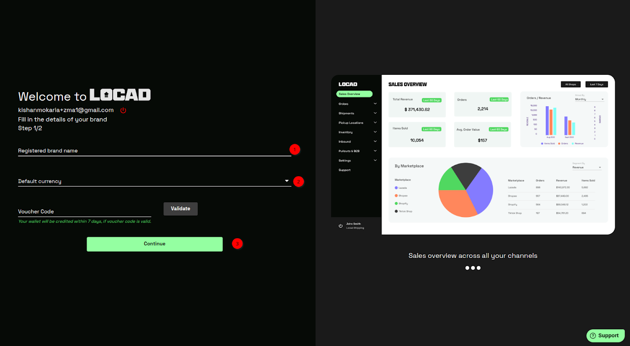 If the brand allows does not exist on OMS: Enter the Registered Brand Name, select the Default Currency, and enter a Voucher Code (if applicable). Click Continue.