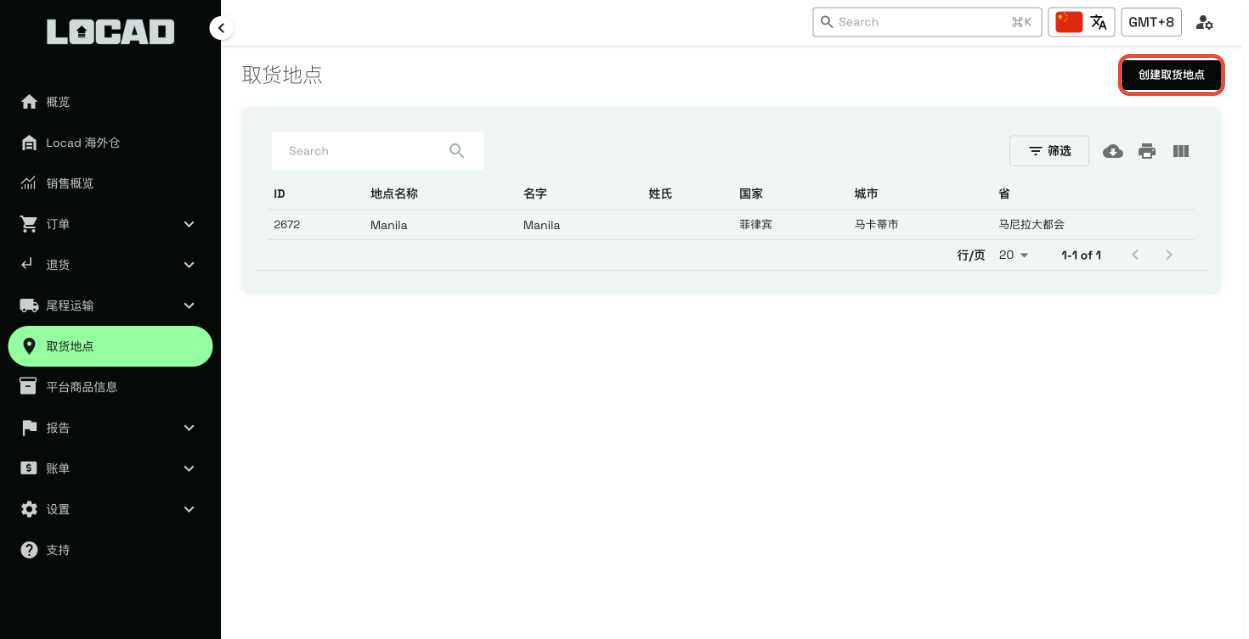 要创建取货地点,请点击侧边栏菜单中的“取货地点”,然后选择屏幕右上角的“创建取货地点”按钮。