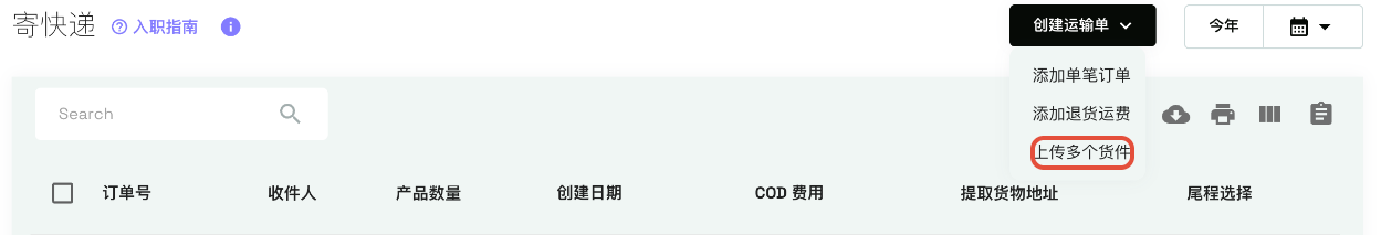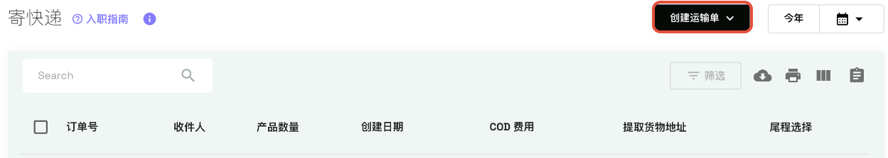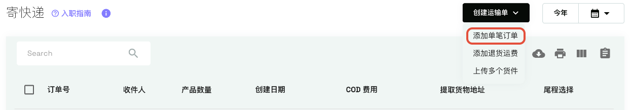如需创建单笔订单,请点击侧边栏菜单中的创建运输单,然后选择“单笔创建”按钮。