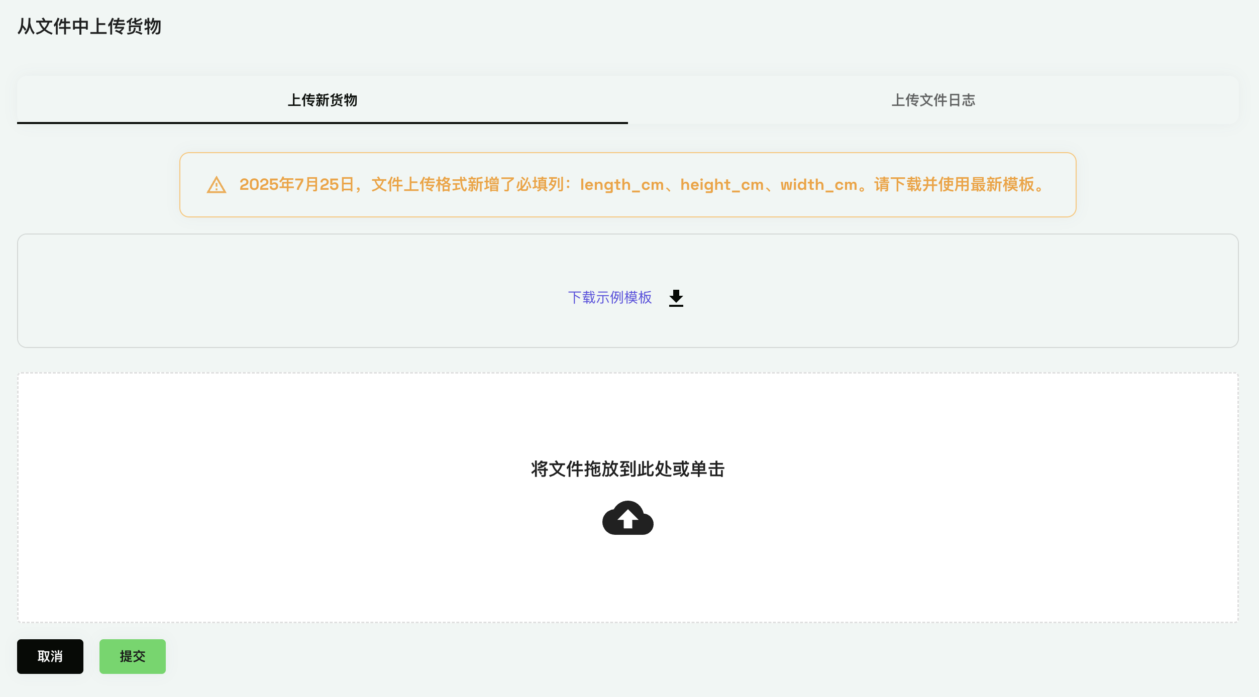 在弹出的窗口中,您可以直接上传已汇总好的货件信息文件。如果您需要标准格式,请先点击下方的链接下载示例模板进行填写。