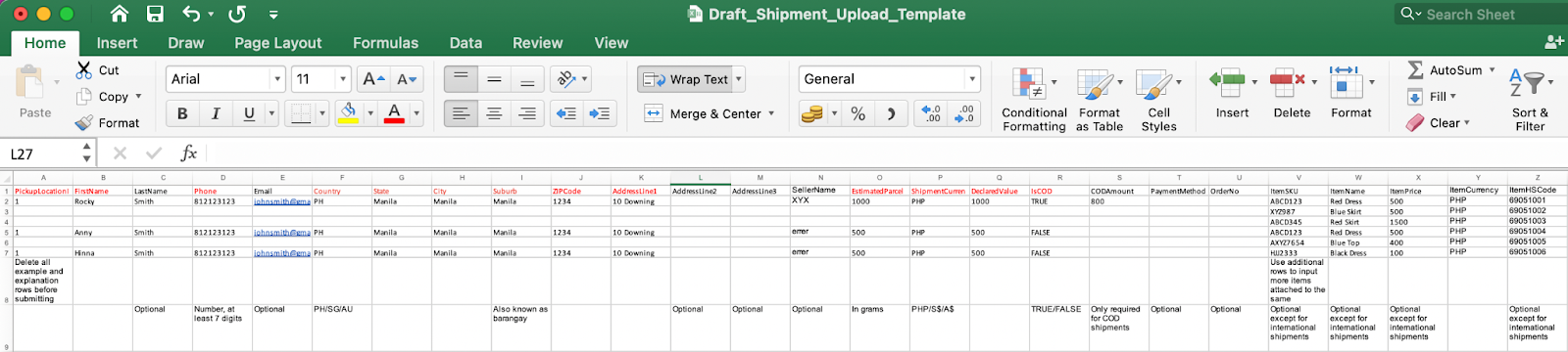 重要提示:请勿修改模板中的各列标题。 您可以删除模板中的所有示例数据,并输入以下详细信息: