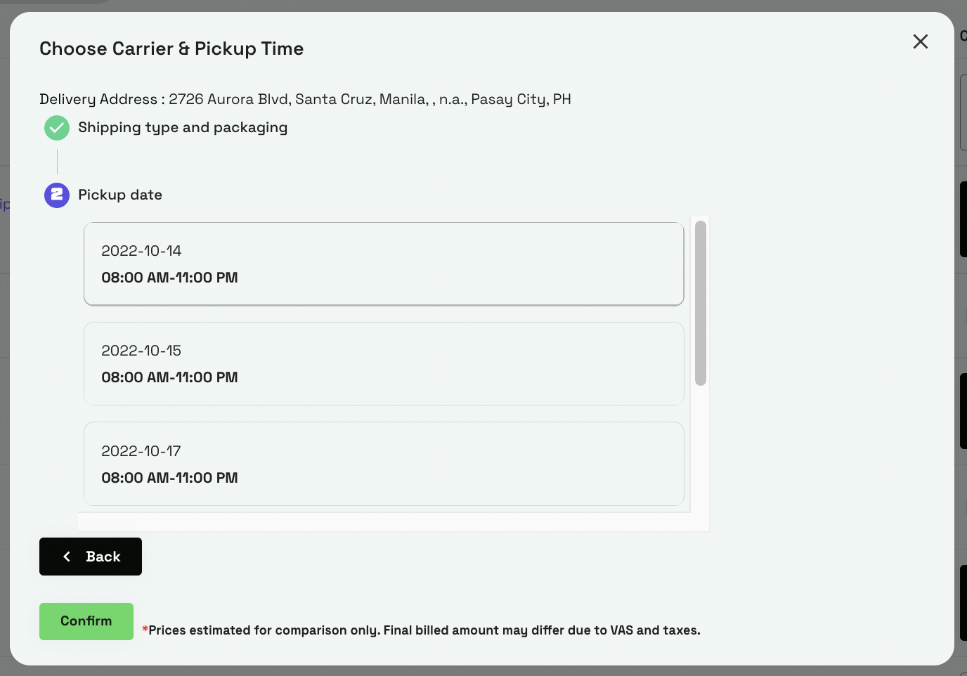 点击物流商选择按钮后,系统将弹出窗口。您可以在此查看所有可用的物流商、选择包装尺寸并预约取货日期。