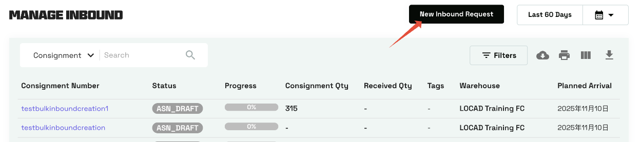 2. 点击页面右上角的“入库单创建”(New Inbound Request)。