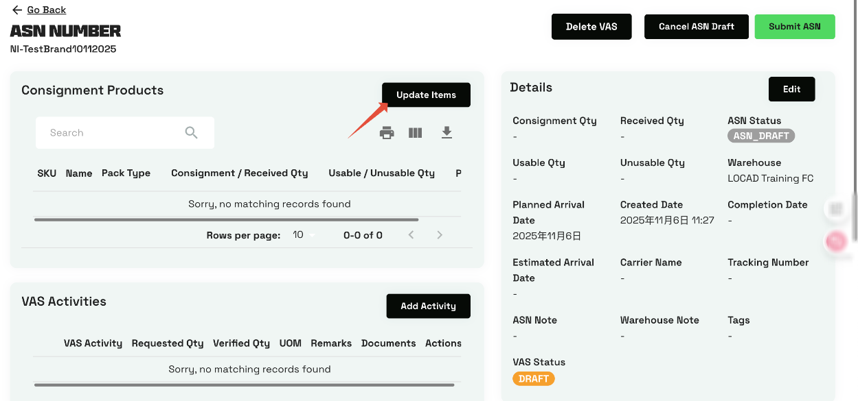 1. 在您创建的ASN草稿中,点击“上传入库”(Update Items)。
