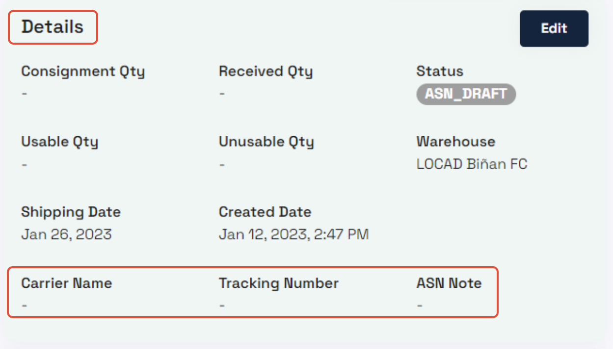 4. 添加尾程(Add Carrier Details):在“详情”(Details)部分,点击“编辑”(Edit)添加尾程名称(carrier name)、物流单号(tracking number)和任何运输说明(ASN Note)。