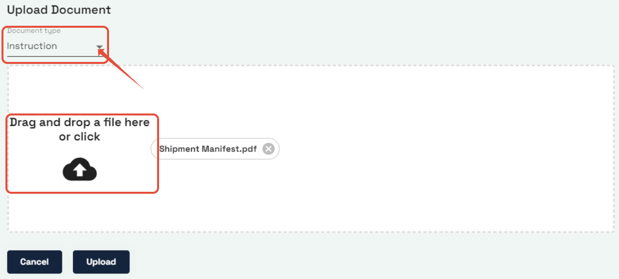 文档类型(Document type)下拉菜单中选择“说明”(Instruction),将文件拖到上传部分,然后点击“上传”(Upload)。
