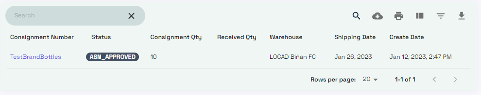 2. 将文件拖放到 ASN 页面的上传区域,然后点击“上传”。产品将出现在寄售产品(Consignment Products)中。