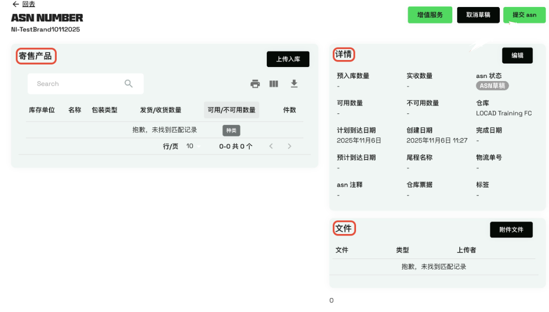 创建ASN草稿后,您需要补充寄售产品(Consignment Products)、详情(Details)、文件(Documents)。