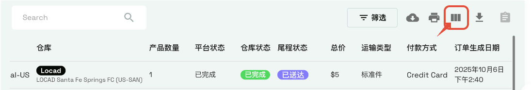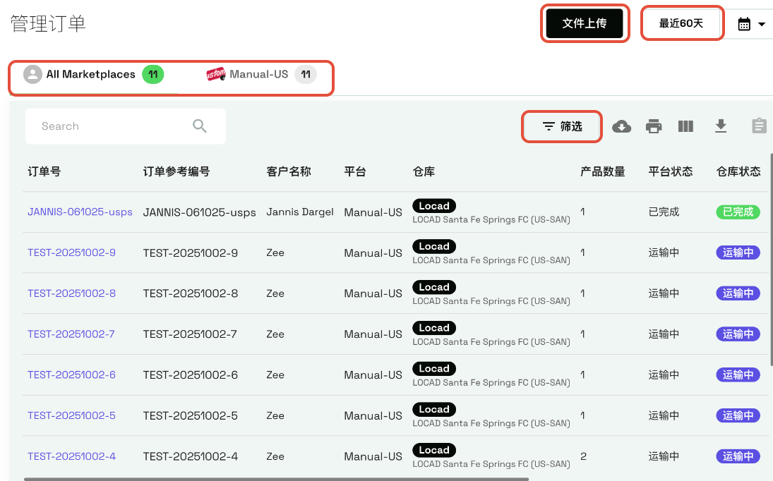 - 筛选:点击筛选功能会出现一个下拉列表,允许您根据仓库状态、目的地等特定条件显示订单。