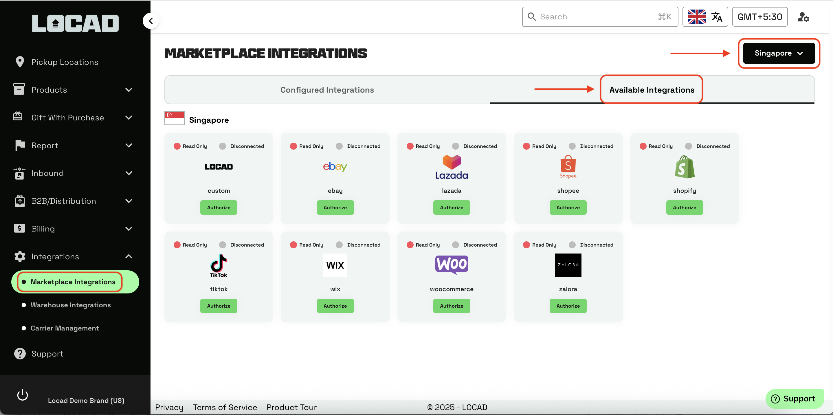 点击“可用的集成”(Available Integrations),您将看到所有可绑定的电商平台,并已按国家/地区(例如:新加坡、泰国)进行分组。