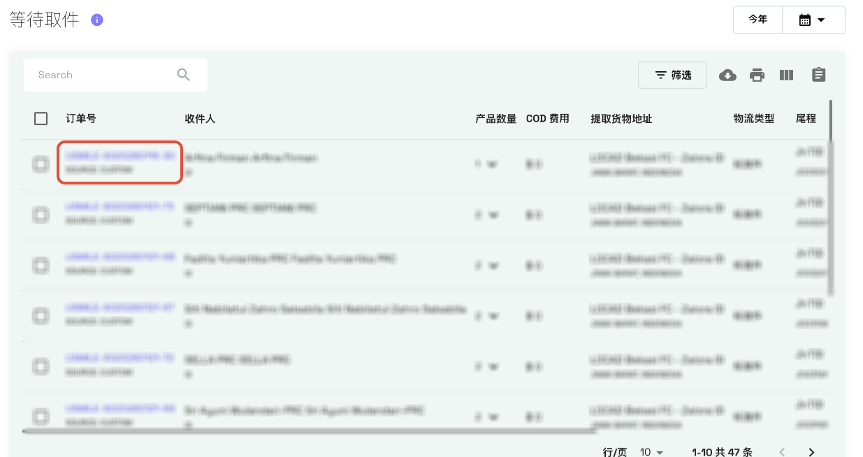前往“尾程运输”>“等待取件”查看已成功预订但仍在等待物流商取件的订单列表。