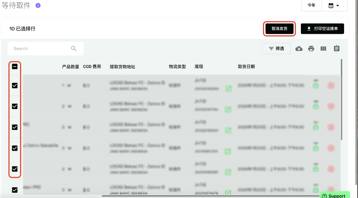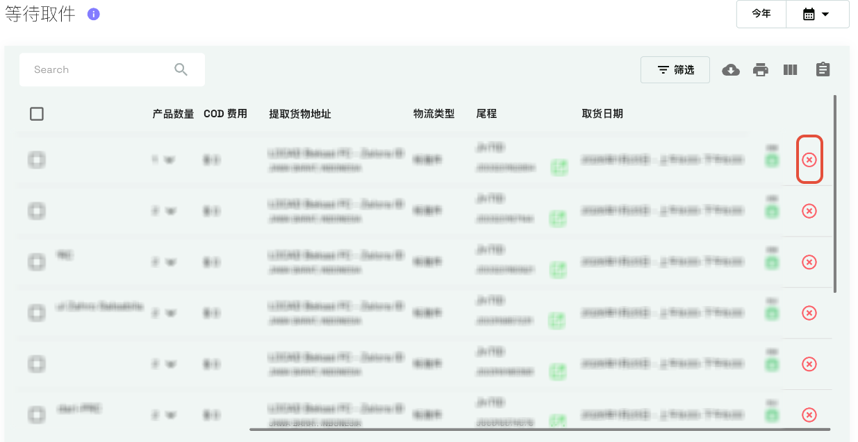 对于单个发货订单:在列表中找到该订单,然后单击该行最右侧的红色“取消物流商预约”图标。
