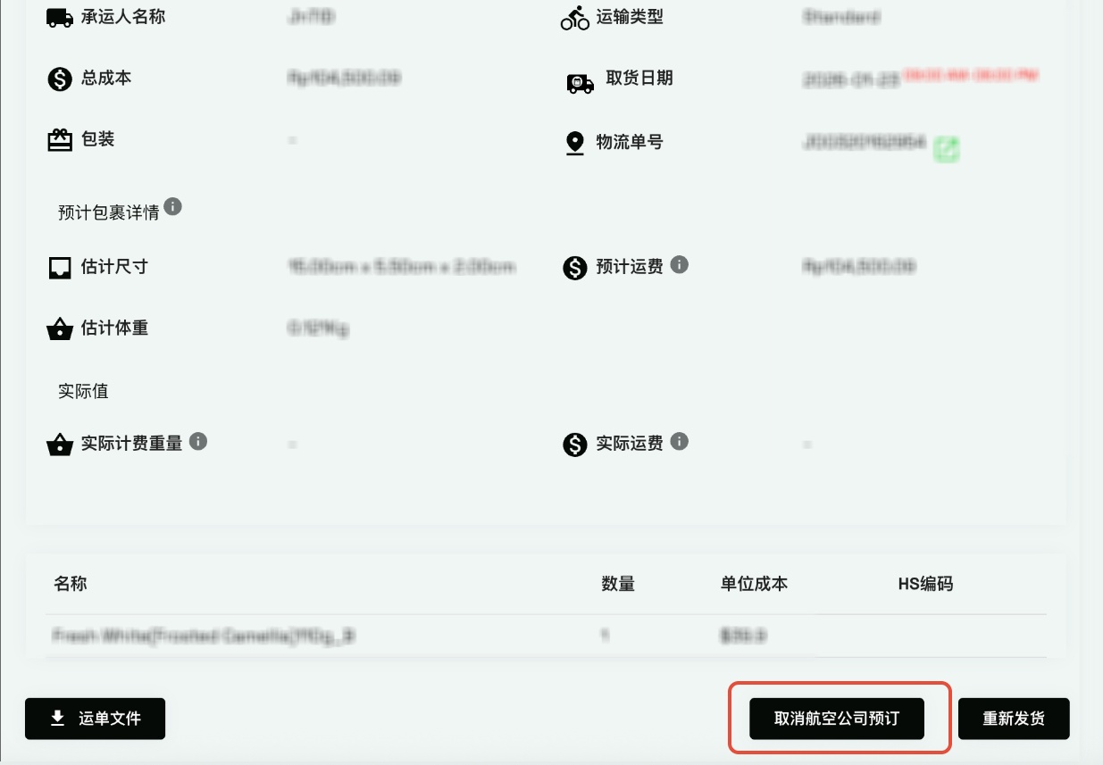 在发货订单详情页面,滚动到页面底部,然后点击“取消航空公司预订”按钮。