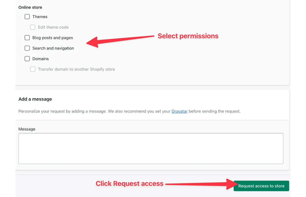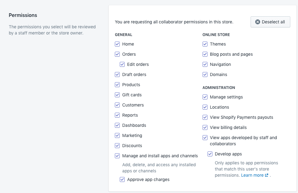 这是最关键的一步:店铺所有者拥有最终决定权。他们可以审核并更改权限,只授予您认为合适的权限,而无需考虑合作伙伴