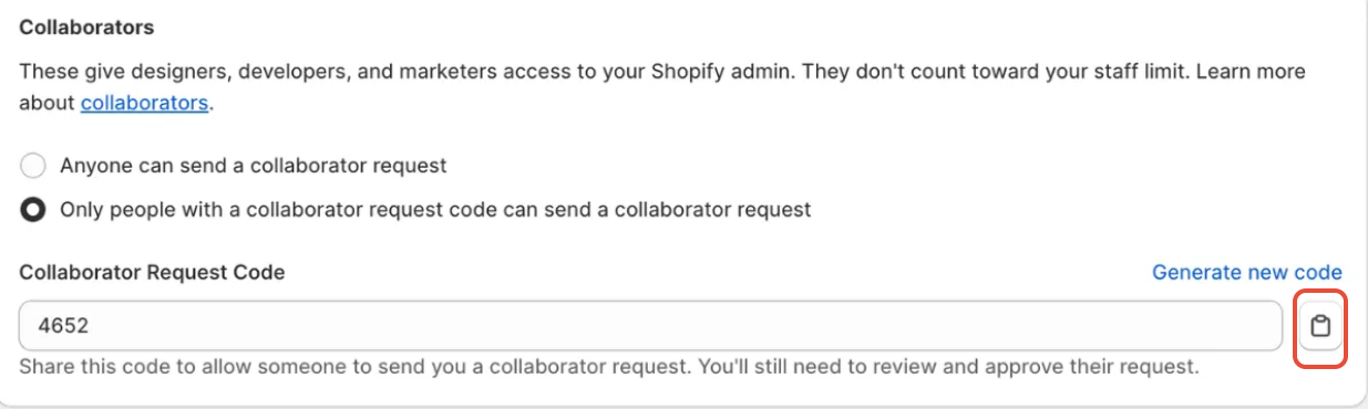 只有拥有协作请求代码的人才能发送协作请求:这是一种更安全的选项。如果您选择此选项,则必须复制 4 位数的代码并将其发送给需要申请访问权限的合作伙伴。