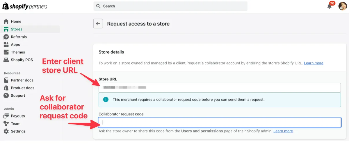 如果店主需要,系统会提示您输入合作者请求代码(collaborator request code)。