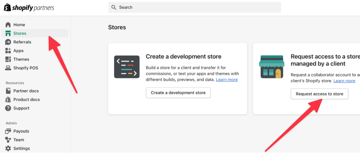 登录您的 Shopify 合作伙伴(Shopify Partner)并转到“商店” ( stores )。
