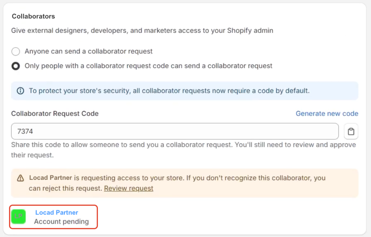 Shopify的合作者访问权限功能允许店主安全地授予外部合作伙伴(例如 Locad)对其 Shopify 后台的访问权限。合作伙伴无需创建员工帐户,即可直接通过其Shopify 合作功能申请访问权限。作为店主,您可以完全掌控权限,并批准、拒绝或自定义授予每位协作者的权限。这是 Shopify 提供的最灵活的帐户之一,使店主能够完全控制协作者可以访问的商店版块。